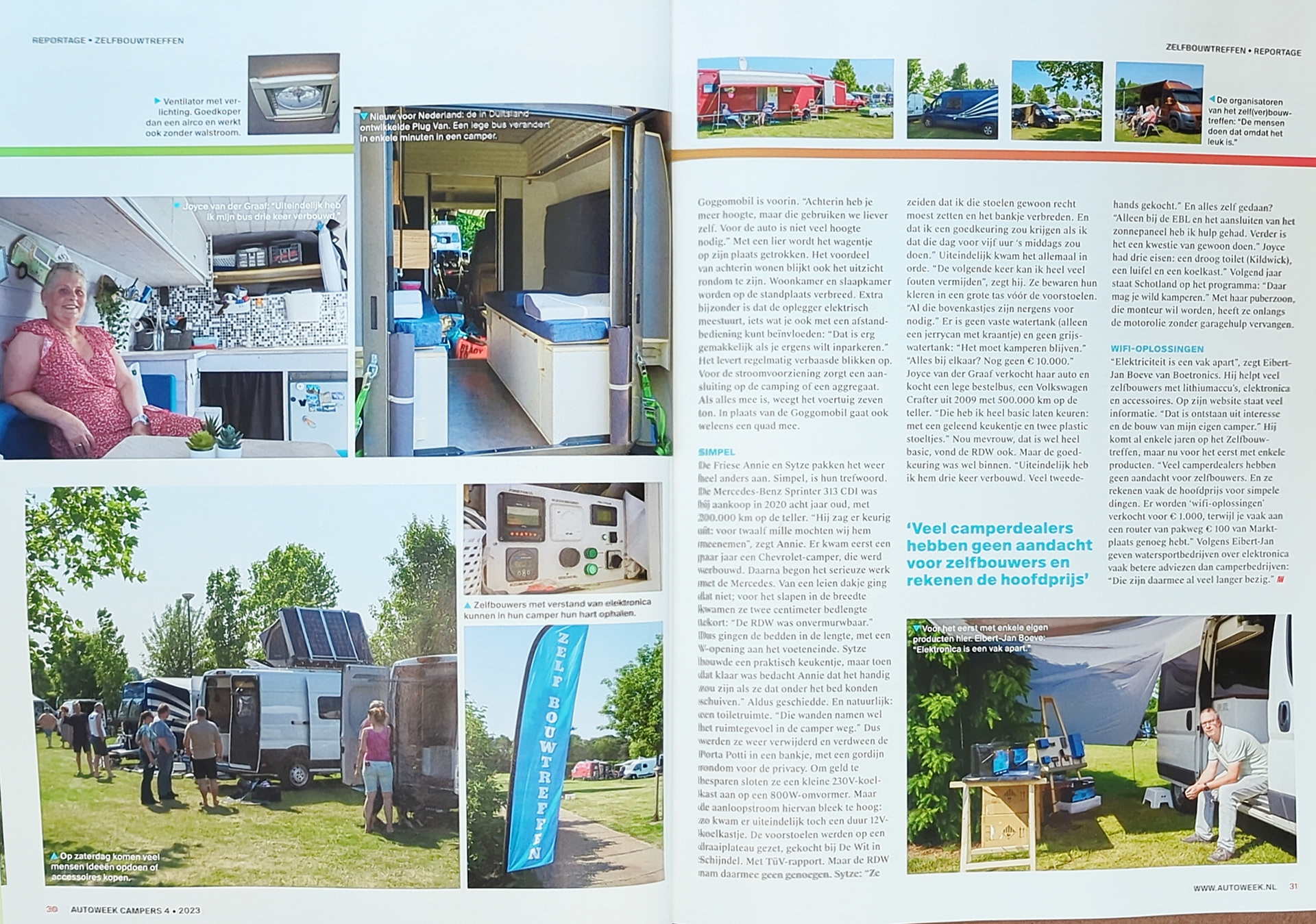 Vier pagina's, gewijd aan een weekend waar zelfbouwers van campers elkaar ontmoeten. Ik was er twee dagen - met mijn fabriekscamper.